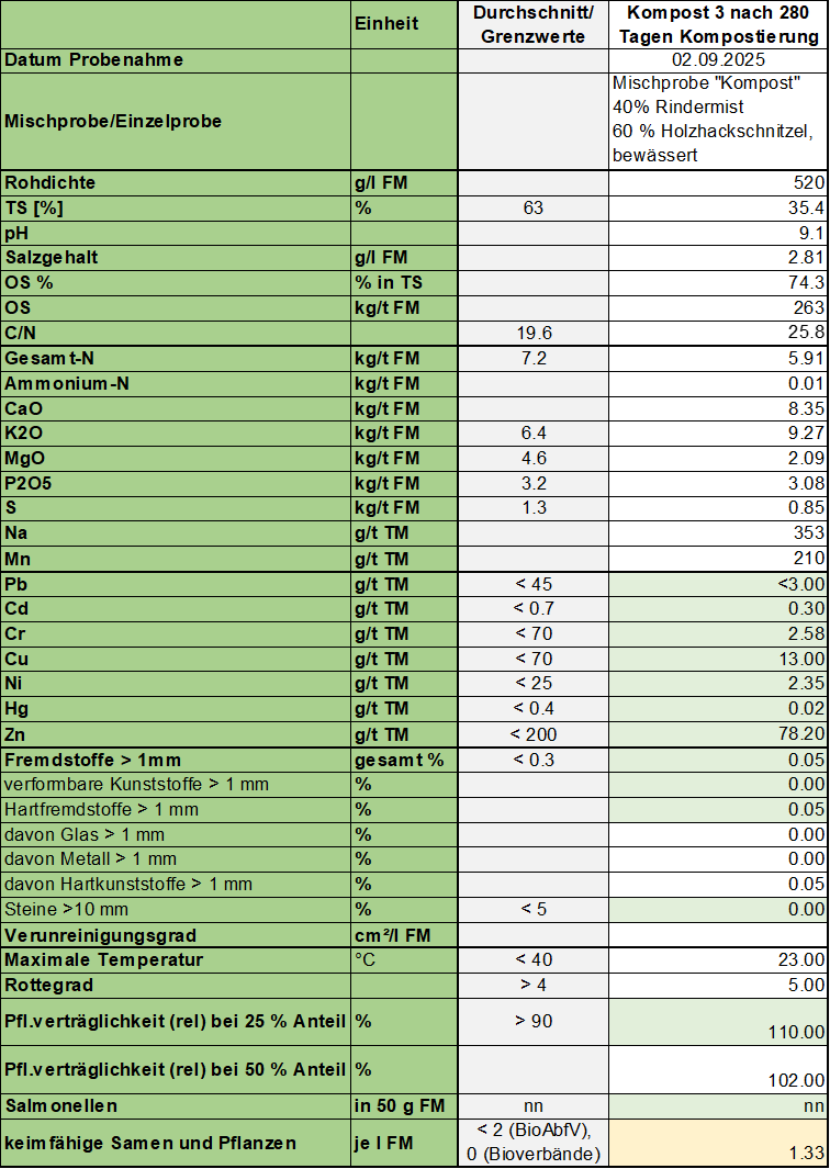 Nach 280 Tagen Kompostierung wurde der Kompost zusätzlich nach Standards des RAL-Gütezeugnisses analysiert. Die Werte in Tabelle 2 zeigten, dass dieser in Bezug auf Schwermetalle und Verunreinigung unbedenklich ist und den Grenzwerten für den Ökolandbau entspricht. Lediglich die keimfähigen Samen sind oberhalb des Nulltoleranzgrenzwertes für Bioland und Naturland, unterschreiten jedoch mit 1,33 Samen je l FM den Grenzwert nach Bioabfallverordnung (2 Samen je l FM). In den Komposten der ersten beiden Versuche wurden keine keimfähigen Samen gefunden. Möglicherweise wurden durch die längere Lagerzeit (280 Tage Jahr 3 vs. 100 Tage Jahr 1 und 2) eher Beikrautsamen eingeweht. Da der Kompost zu Luzernekleegras ausgebracht wird, das durch die Schnitte beikrautunterdrückend wirkt, werden 1,33 Samen je l FM nicht als bedenklich eingestuft.
