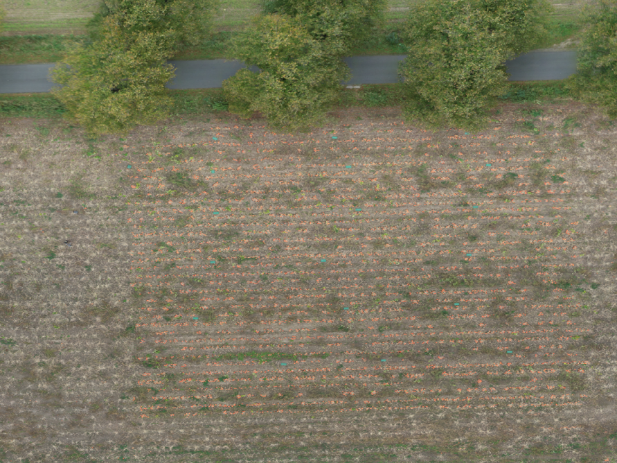Vor der Versuchsernte wurden Drohnenfotos (Typs DJI Phantom RTK 4) aus 25 m Höhe vom Versuch aufgenommen. Mit Unterstützung von Lucas Wittstruck (FH Osnabrück) wurden die Luftaufnahmen zu einem georeferenzierten Orthomosaik zusammengesetzt, über das die GPS-Parzellenmarkierungen gelegt werden konnten. Mit Hilfe dieser Luftausnahmen wurde versucht, eine Ertragsschätzung durchzuführen.
